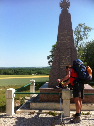Een van deze plaatsjes was op het kerkhof achter het kerkje in Bailly le France. Een piepklein plaatsje met een klein idyllisch kerkje. Achter de kerk was een overkapte buitenplaats met een bankje waar veel wind stond, precies wat we nodig hadden om af te koelen. We hebben daar bijna een uur gezeten en gehangen om een beetje bij onze positieven te komen. Het voordeel van kerkhofjes is dat er meestal een waterkraantje (eau potable) is om de watervoorraad aan te vullen. Het laatste stuk naar Chavanges wijken we een paar km van de route af omdat in dat dorp een ADP (overnachtingplaatsen voor pelgrims) staat aangegeven. Als we daar aankomen is "de Mairie" (gemeentehuis) dicht. T belt de overnachtingplaats wat een soort van hotel blijkt te zijn, vette prijzen dus. Van de route afwijken voor een duur hotel was tegen het zere been. Op de trap van "de Mairie" even zwaar beraad maar dan staat PP op met de mededeling "dan de burgemeester maar". We bellen aan bij het huis naast "de Mairie" alwaar we doorverwezen worden verder in de straat. Als we aanbellen bij een behoorlijke villa worden we te woord gestaan door de burgemeester en zijn vrouw.