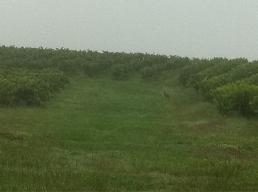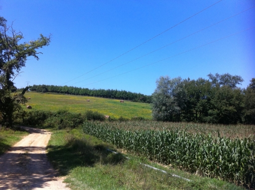 We zitten vandaag duidelijk weer in een gebied met veel wijnboeren. Onze wandelpaden voeren ons tussen de wijngaarden door. De Armagnac, een soort van cognac boven de 40% en de Floc, een likeur van rond de 17% zijn producten uit deze streek. Floc hebben we gehad bij madame Therese en een glaasje Armagnac na het eten op T's verjaardag. Wij samen prefereren de Floc boven de Armagnac. Meer dan 40% is teveel van het goeie. In een van de wijngaarden lukt het ons een ree vast te leggen. Hij is ver en klein maar hij is te zien.